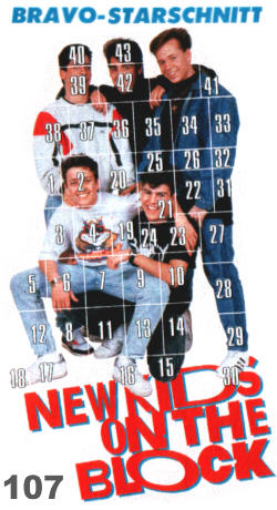 ![]() Die fünf Boys aus Boston* waren die Superband 1990 und zugleich der einzige Starschnitt in diesem Jahr. Durch 19 BRAVO-Hefte hindurch mit satten 45 Teilen ist er auch schon ganz stattlich geworden... Entgegen der Pressemeldungen zum Comeback des Starschnitts 2000 mit Britney Spears war dies nicht der letzte Starschnitt, 1991 folgte noch Chesney Hawkes und 1992 Jason Priestley. * Donnie Wahlberg, Jonathan und Jordan Knight, Danny Wood und Joey McIntyre |